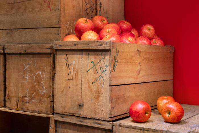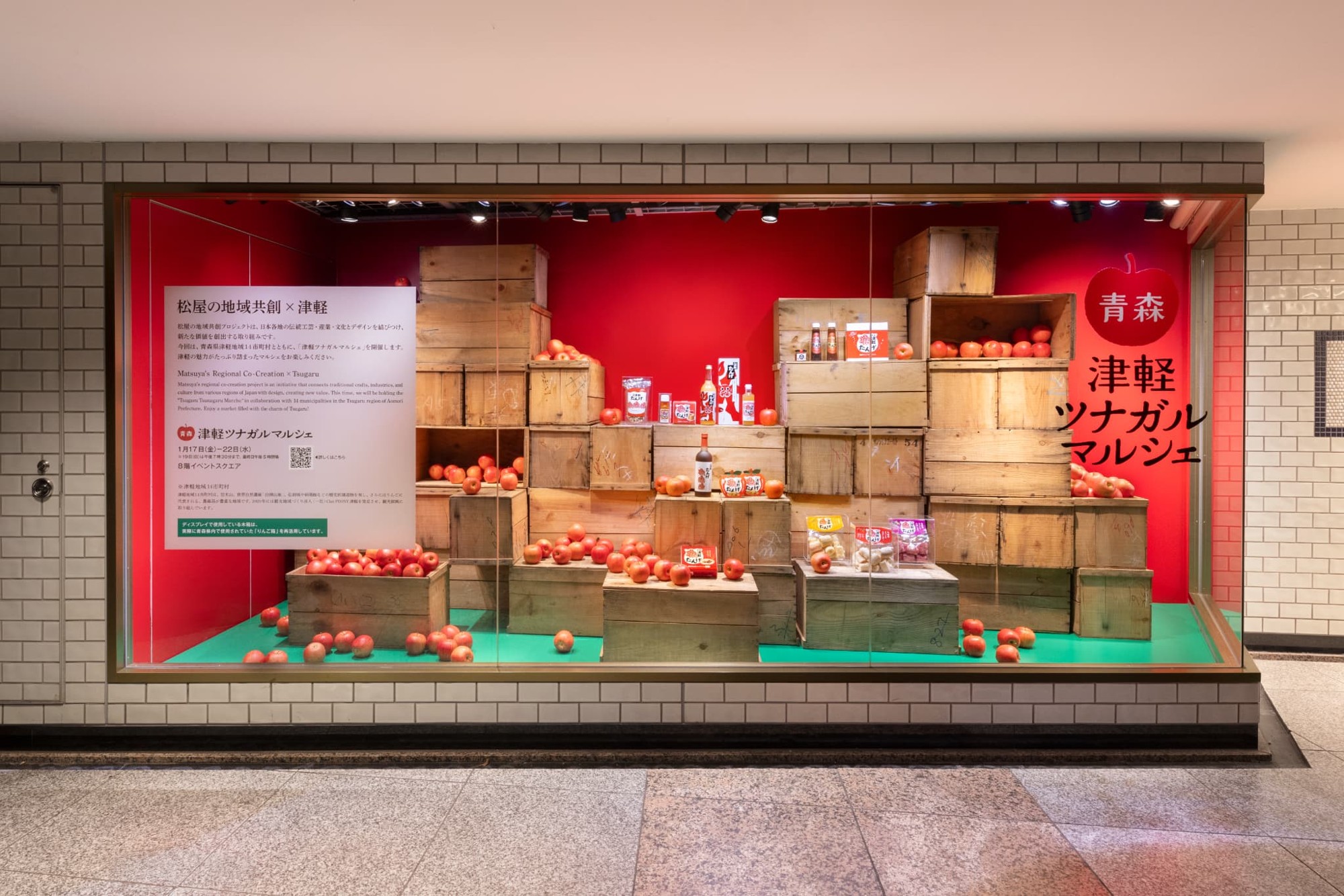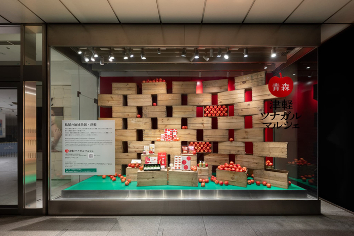 株式会社松屋(東京都中央区)の「デザインで繋ぐ、地域共創装飾プロジェクト」に賛同し、2021年から続けているサステナブル装飾を使用したコラボレーションが今回も実現。商業施設の館内装飾はその時々のテーマに合わせて制作、設置されるため撤去後には廃棄してしまう事も少なくありません。処分するものをゼロにすることは難しくても、再利用できるようあらかじめ綿密にデザインし、アイデア次第で新しいデザインに見せていく、出来る限り使い捨てを減らしていくことは私たちにもできるかもしれません。そこで今回使用する装飾の一部に、松屋銀座が2025年1月に実施した青森県津軽地域の物産展「津軽ツナガルマルシェ」のインスタレーションで使用したりんごのオーナメントをリユースいたします。
