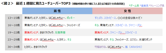 どの年代も知名度の高いユーチューバーが上位に挙がるが、特に19~29歳男性と19~22歳女性では「東海オンエア」が2位以下を引き離して一強であった。さらに男性では「ポッキー・兄者弟者・キヨ」などのゲーム系チャンネル、女性では「すとぷり・スカイピース・嵐・ジャニーズJr.」といった音楽系や、「竹脇まりな」といったトレーニング系などが上位の回答にあがった。<図2>