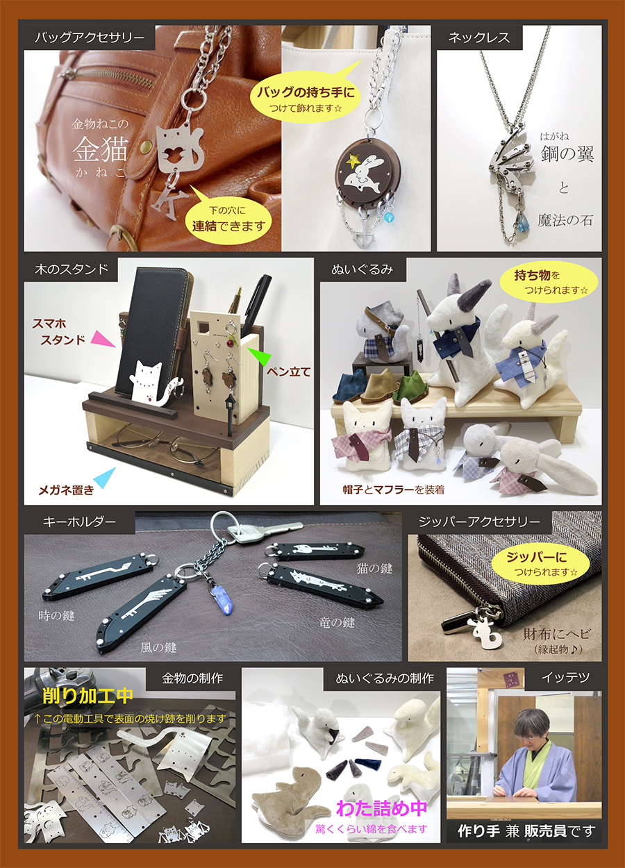 猫をメインに小物やステンレスアクセサリー、布製のぬいぐるみや木製の雑貨を作り、作家本人が販売してます。