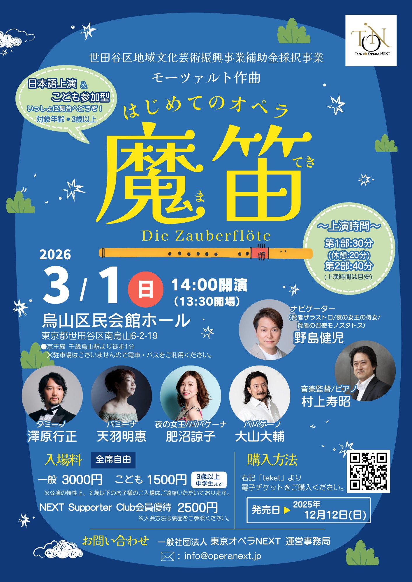 3月1日、世田谷にて上演される「はじめてのオペラ《魔笛》」は、子ども参加型の体験型オペラ公演です。ナビゲーターは人気声優・野島健児氏。初めてオペラに触れる子どもたちを物語の世界へ導きながら、大人も満足できる本格的な舞台を届けます。