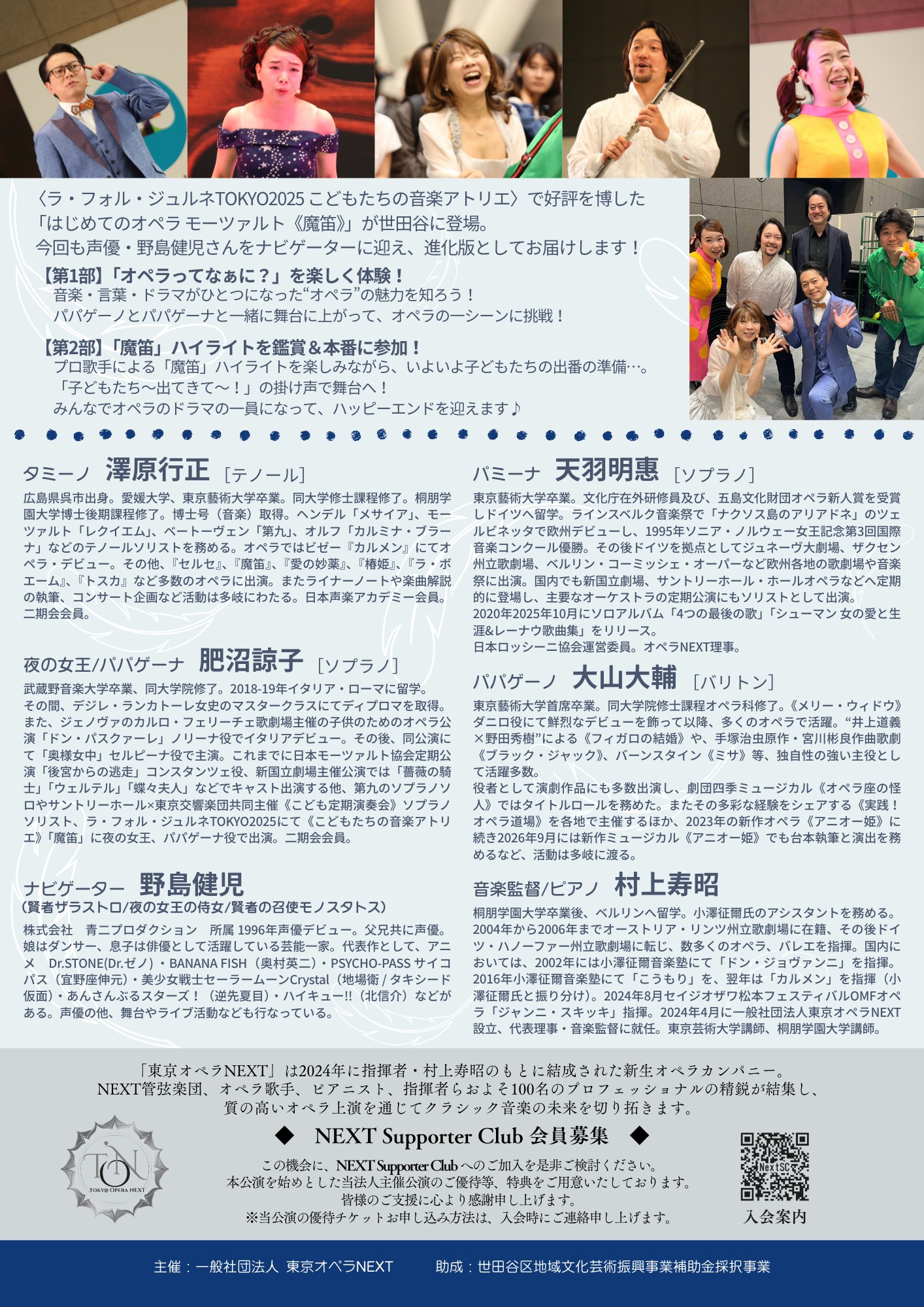 第2部ではモーツァルト《魔笛》の名場面をハイライト上演。参加型でありながら、出演者は国内外で活躍する第一線のアーティスト。教育性と芸術性を兼ね備えた舞台です。