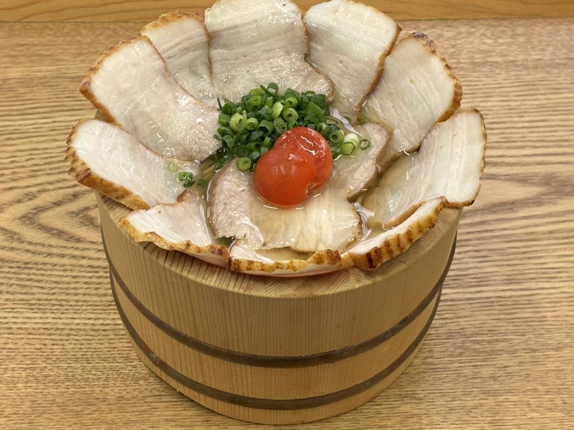 「富士の介」をはじめとした淡水魚の煮干し、山梨県のブランド鶏のガラなどを使用しているあっさりなスープが特徴です。さらにトッピングには山梨県のブランド豚「富士桜ポーク」のチャーシューを盛り沢山にのせました。そしてその他にはプチトマトのさっぱりとした味わいとねぎのアクセントを添えて提供いたします。