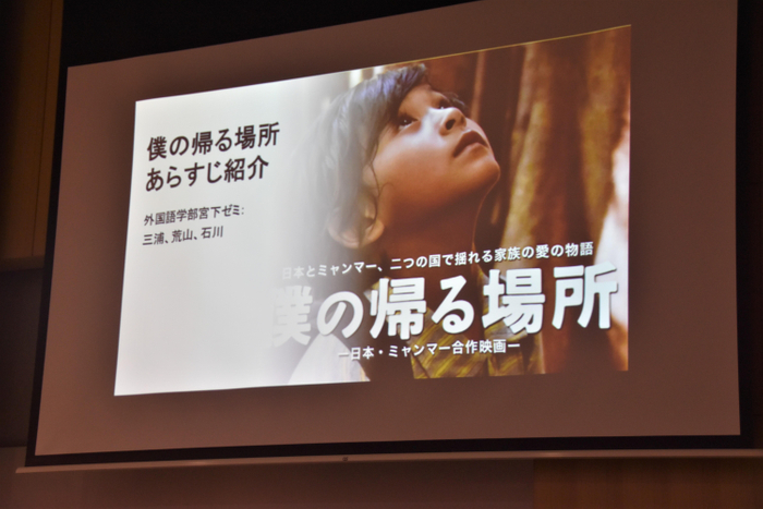 深刻化する難民問題について知り・伝え・行動する社会連携実践演習に取り組む外国語学部の宮下大夢准教授とゼミ学生が7月15日、ナゴヤドーム前キャンパスで「名城大学難民映画祭」を初めて開催し、在日ミャンマー人家族に起きた、切なくも心温まる感動の実話『僕の帰る場所』を上映しました。一般市民も参加可能な講座とあって、親子連れや学生など60人以上が参加しました。