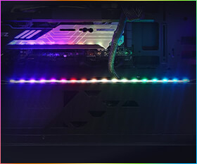 GPUアクリルプレートはグラフィックスカードの下部に設置され、イルミネーションを楽しむことができます。ライティングは専用ソフトウェアでお好みのカラーに調整が可能!この機会に、ぜひお得にドレスアップしたゲーミングPCを手に入れてください!