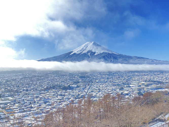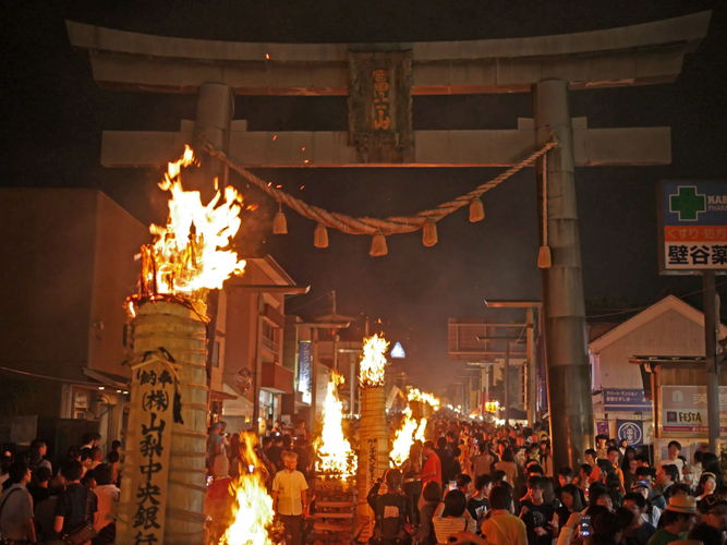 宝永の大噴火を最後に300年以上も静穏を続ける富士山ですが、太古の昔には、たびたび噴火を繰り返していました。人々は、激しく吹き上げる火焔に神の怒りを重ね合わせ、それを鎮めるために、神を祀り神事を執り行ったと言われます。北口本宮冨士浅間神社と諏訪神社の両社の秋祭りで、富士山のお山じまいの祭りとして毎年8月26日、27日に行われる吉田の火祭りは、400年以上の歴史を持ち、日本3奇祭、日本10大火祭りにも数えられます。「火祭り」は前夜祭にあたり、国道に立ち並ぶ高さ3mの大松明と家ごとの松明に火が灯され、富士山の麓が火に照らされる様子は壮観の一言。