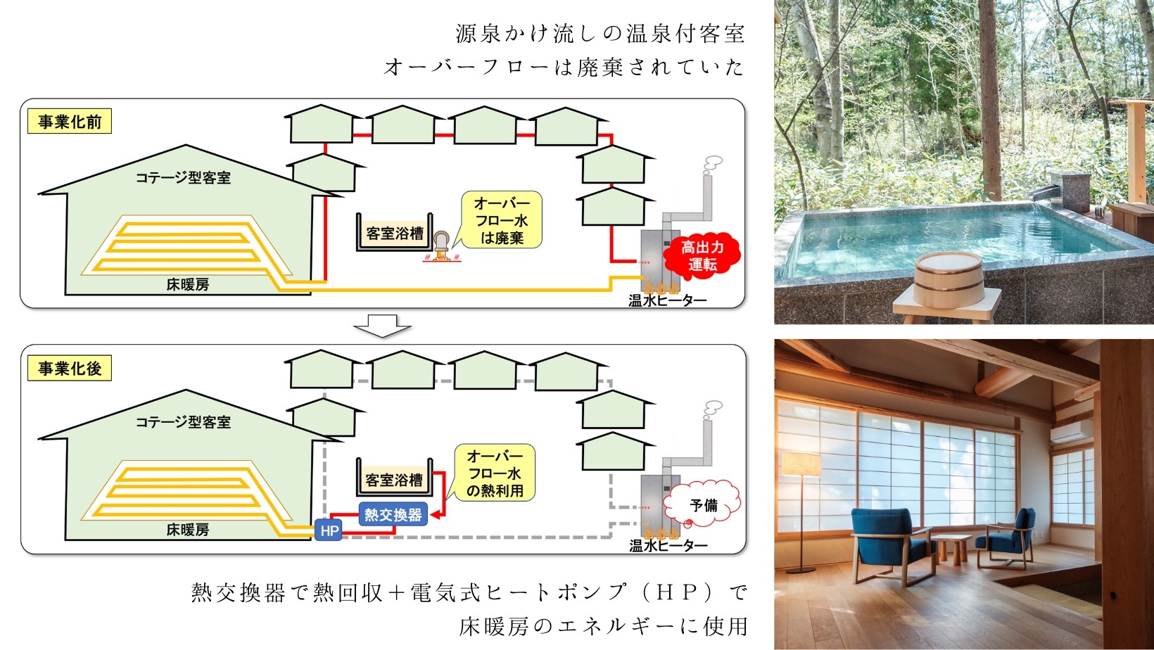 これまで使われずに廃棄されていた温泉の熱エネルギーを回収し、電気式ヒートポンプと併用することで、給湯のプレ加熱や客室の床暖房などに活用しています。これにより、エネルギー使用量の大幅な削減につながっています。