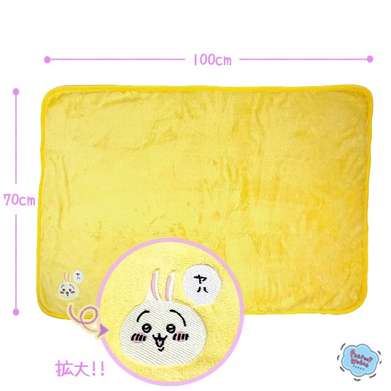 巾着に収納されたブランケットは元気をもらえそうなイエローに、ワンポイントで刺繍のうさぎがついています。サイズは70cm×100cmの、大人も大満足なサイズです。