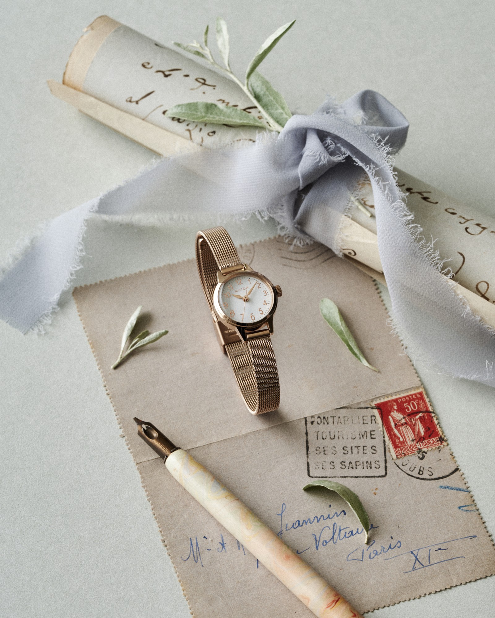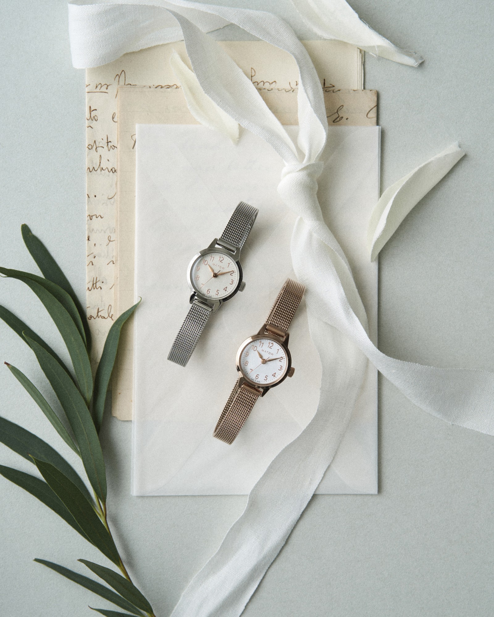 今回新たに加わったメッシュバンドは、月光のきらめきを繊細に編み込んだかのような輝きをまとい、シルバーとローズゴールドの2カラーで展開。ステンレススチール製のしなやかなメッシュは軽やかで肌に馴染みやすく、ジュエリー感覚で腕元を飾ります。