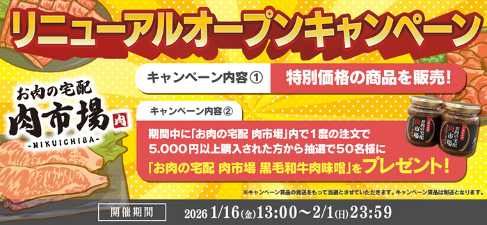 JA全農が運営する産地直送通販サイト「JAタウン」に出店する「お肉の宅配 肉市場」は、2026年1月16日リニューアルオープンいたします。リニューアルを記念して、特別価格の商品の販売や「お肉の宅配 肉市場 黒毛和牛肉味噌」が当たるキャンペーンを開催いたします。