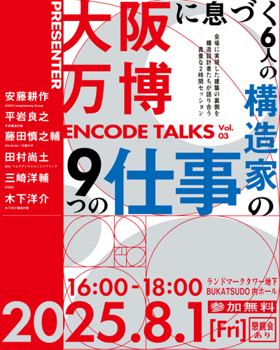 2025年8月1日(金)、横浜・みなとみらいにて、特別トークイベント『大阪万博に息づく、6人の構造家の9つの仕事 | ENCODE TALKS vol.03』が開催されます。