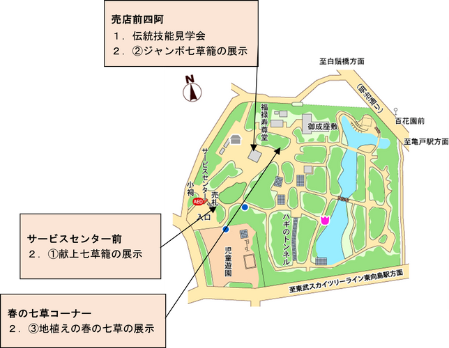 今年も向島百花園職員による七草籠制作の実演をご覧いただく見学会と、「献上七草籠」や直径約50cm、高さ約1mの「ジャンボ七草籠」、「地植えの春の七草」等の展示を行います。