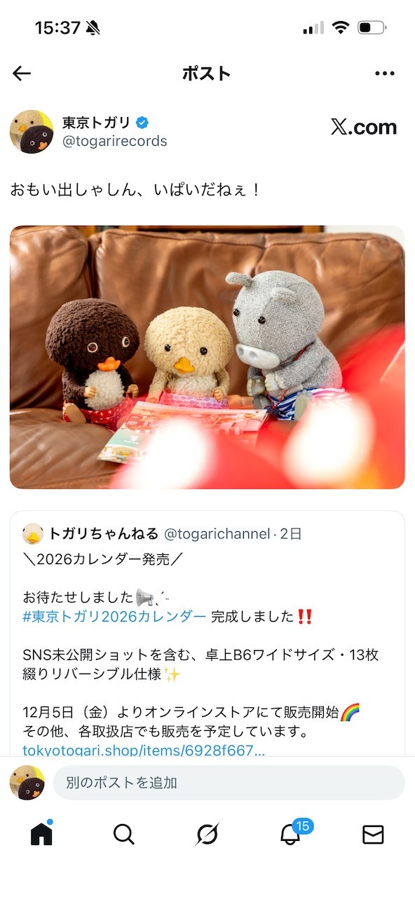 毎日更新されるX(ツイッター)には、トガリくんのほっこりする日常がかわいい写真と一緒にたくさんアップされていて癒されることまちがいなし。