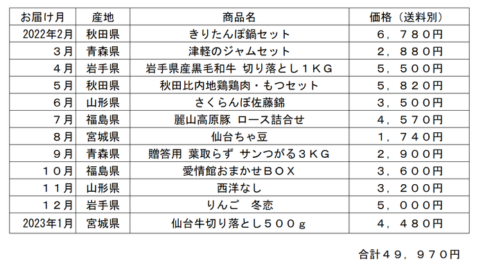 商品は毎月、青森、岩手、秋田、宮城、山形、福島の東北6県から厳選した特産品を産地直送でご自宅にお届けします。