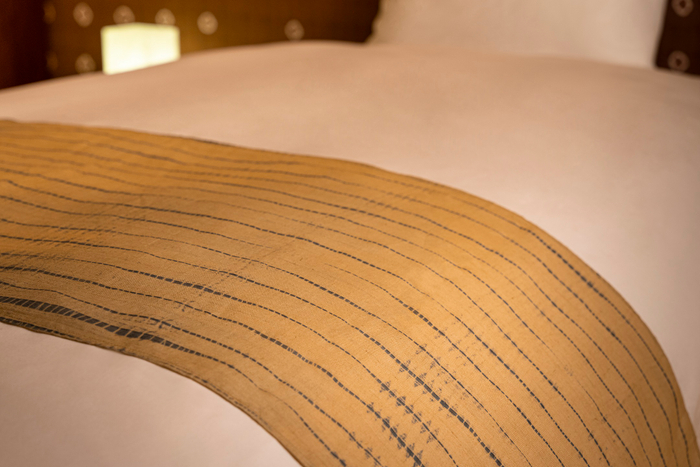 全70室の客室からは眼前に広がる別府湾を望むことができ、海を絵画のように楽しめる「ピクチャーウィンドウ」が特徴です。また、海の色を引き立てるために壁紙や障子、浴室のガラスには、別府の名所「血の池地獄」の赤から着想を得た古代色の「柿渋色」を用いました。これは、日本一の源泉数及び湧出量を誇る別府温泉の熱気や、温泉が湧きだす溶岩台地の土っぽさを表現しています。そして、室内には、豊後絞り(*)をヘッドボードやフットスローなどのインテリアに用いており、地域の伝統工芸や文化に触れることができます。