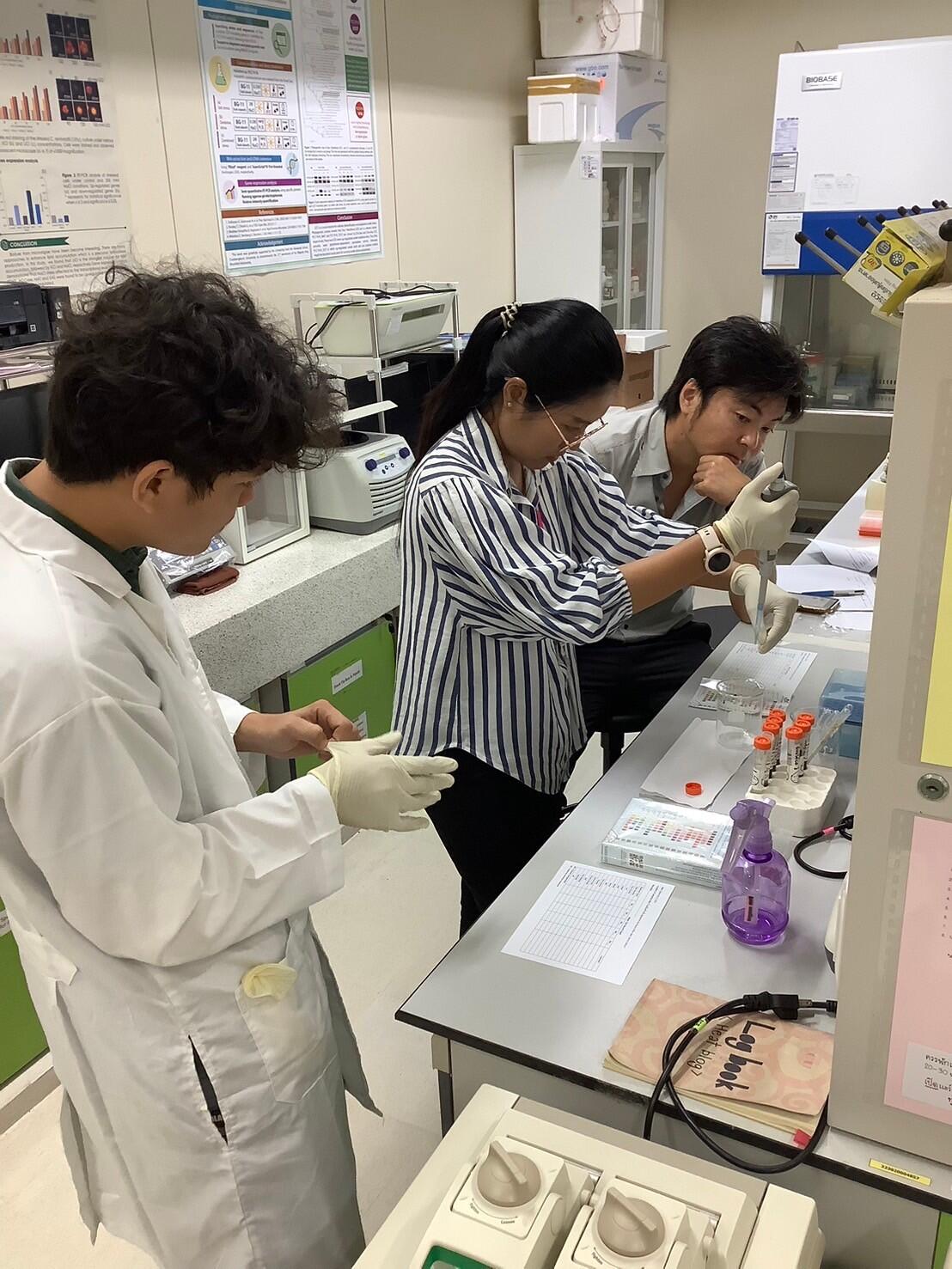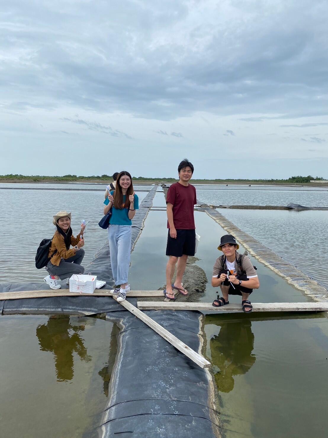 フィールドワークでは、タイ・サムットサーコーン県の塩田を訪れ、高塩濃度環境に生息するシアノバクテリアのサンプリングを行い、実験室に持ち帰って単離作業を行いました。景山教授とWaditee-Sirisattha教授は極限環境に生息する特殊なシアノバクテリアの生存メカニズムの共同研究を長年実施しており、今回のフィールドワークは新たな研究対象株の発見を狙って実施されました。