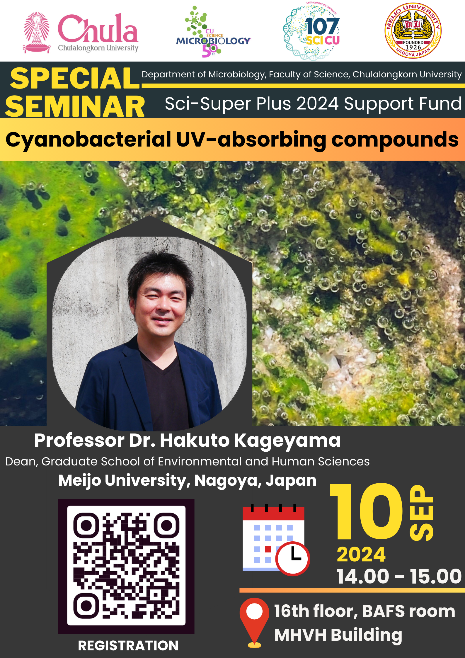 特別講演では、「Cyanobacterial UV-absorbing compounds」と題してシアノバクテリアが生産する紫外線吸収物質についての研究発表を行いました。チュラロンコン大学理学部より多くの教員や学生が参加し、発表後には活発な議論がなされました。