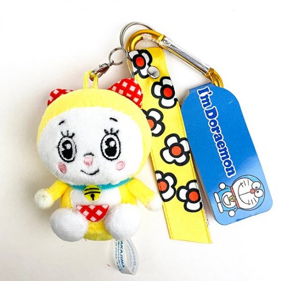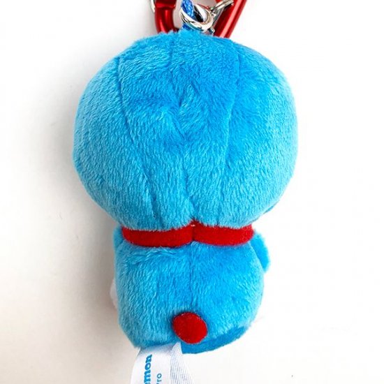 それでは、今回のアイテムはこちらです♫どら焼きを抱えた姿がかわいい、ドラえもんのマスコットです。ふわふわな手触りも気持ち良くて、バッグに取り付けできるカラビナ付き♪リボンにはタイムふろしきのデザインも♪