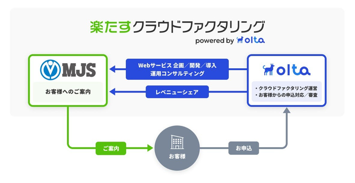 本提携において、OLTAはWebサービスの企画・開発・導入および運用に関するコンサルティングをMJSに提供し、本サービスにおけるシステム基盤、審査・与信、債権買取業務はOLTAが担います。MJSはクラウドサービスの「楽たす」シリーズの新サービスとして本サービスサイトを提供し、全国33拠点のネットワークと顧客基盤を活かし、中小企業・小規模企業への本サービスの案内・提案を担います。