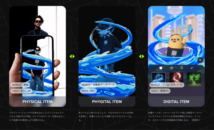 “フィジタル”とは、Physical(フィジカル)とDigital(デジタル)をかけ合わせた造語です。「XRT」とは、さまざまなIPやコンテンツの世界観を拡張するファッションにおける新規格。フィジカルなアイテムと、デジタルなアイテムを紐づけることで、それぞれの利用を可能にする「フィジタルアイテム」の所有を通じて、自己と他者・個々とコミュニティをつなぐ新たな手段を提供します。