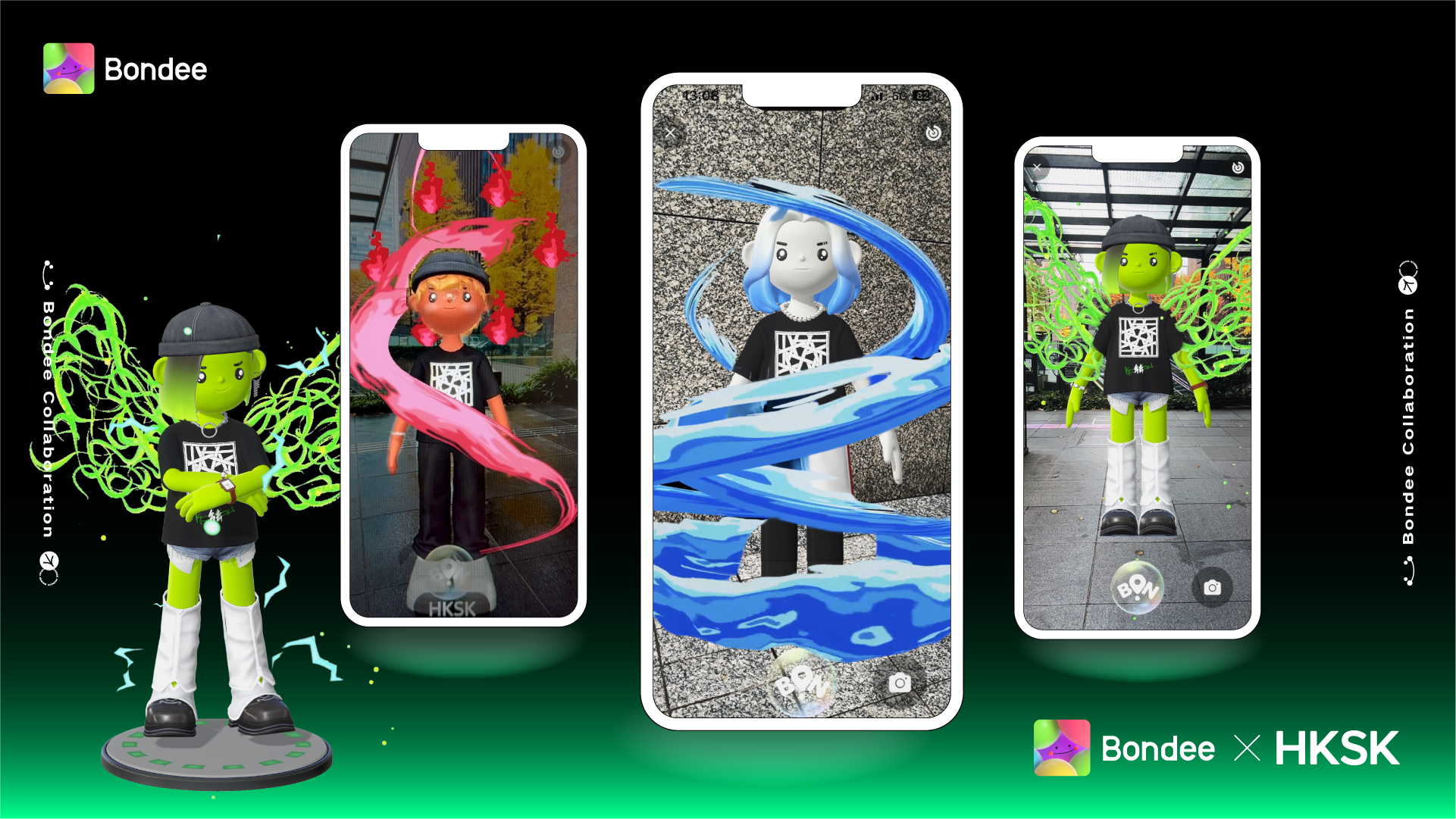 ブース内ではHKSK Studiosが提供する、メタバース/Web3.0時代におけるファッション「XRT」に関する展示と、その技術を用いて、「Bondee」のAR機能を使用した「BON」を通しメタバース空間で「XRT」を着用いただける体験が可能です。