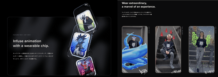 Tシャツ袖口のホルダーへ装着し、チップにスマートフォンをかざすことで、ARフィルターが起動します。チップを入れ替えることで、様々な自己表現や楽しみ方が可能になります。