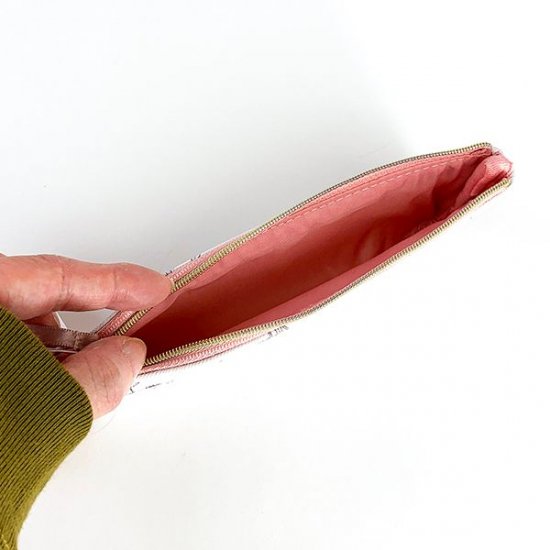 内側もピンクの布地になっています。ラウンドポーチはサイドまでファスナーが開くので、中身の出し入れのしやすさも格別ですよ。