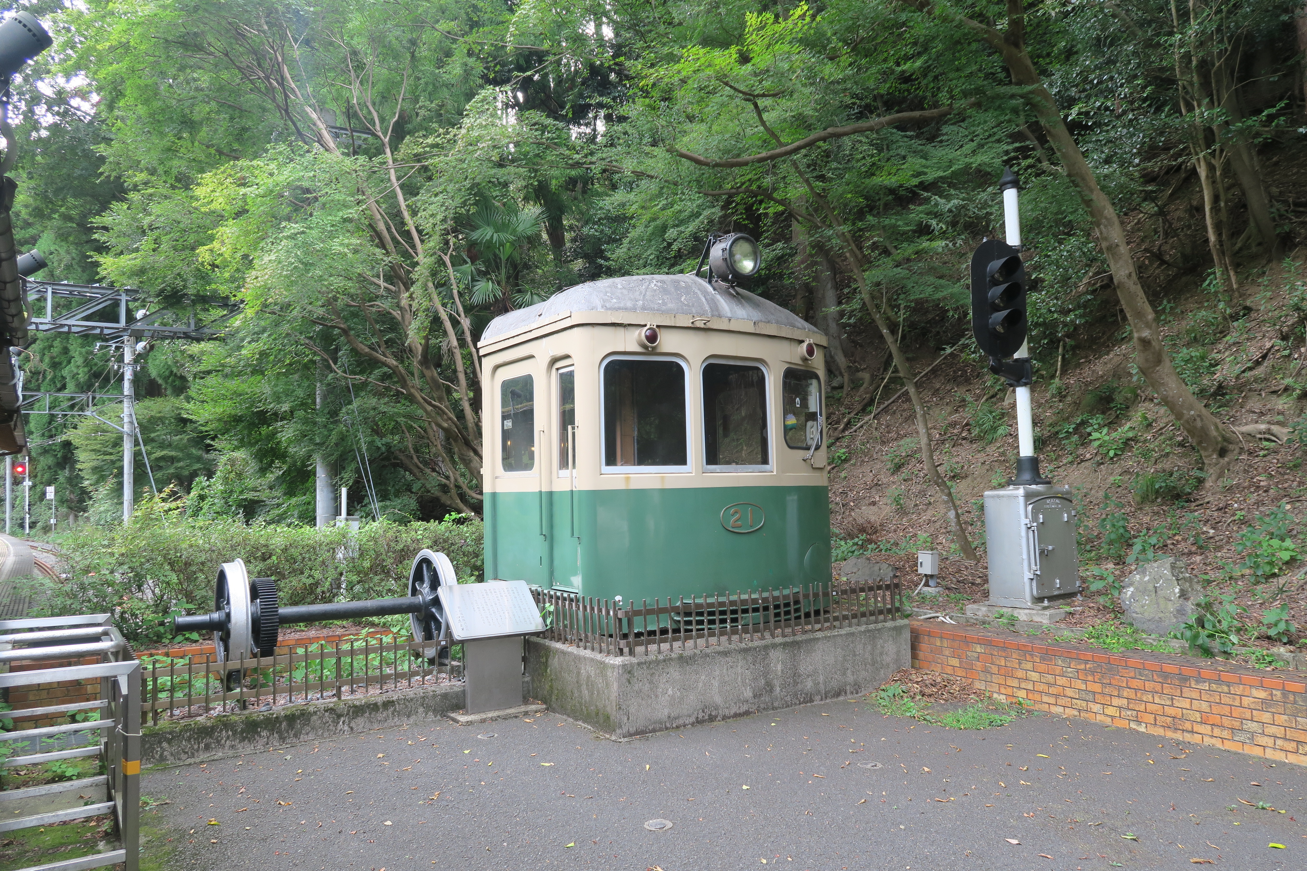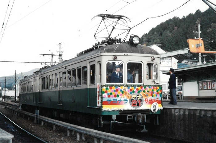 開業間もない頃から活躍するノスタルジックな車両は、多くの沿線の皆さまや鉄道ファンの皆さまに親しまれましたが、老朽化などで徐々に数を減らしていき、最後まで残っていた21号車+22号車が引退。21号車は運行終了の翌年、1995(平成7)年8月より前頭部をカットモデルとして鞍馬駅前に展示しています。