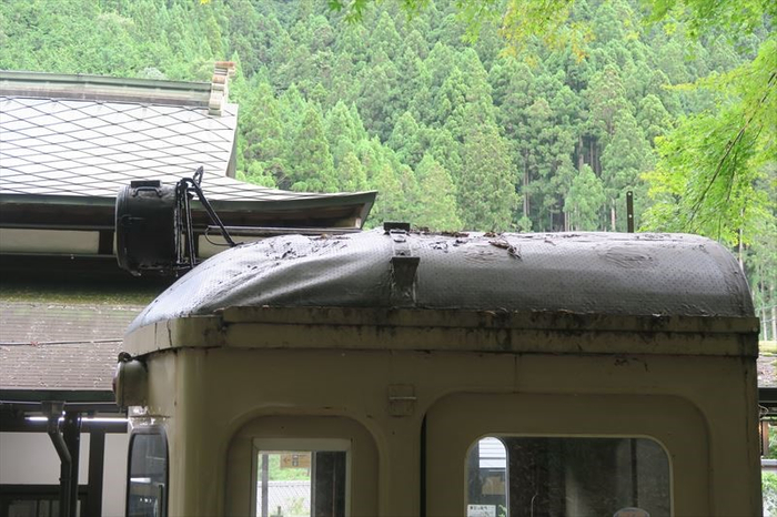 デナ21型21号車は運行終了の翌年、1995(平成7)年8月より前頭部をカットモデルとして鞍馬駅前に展示しております。幾度か修復してまいりましたが、約30年もの間、雨ざらし状態での保存であるため痛みが激しく、最近は木製の屋根が腐ったり、外板が腐食したり老朽化が著しい状態となっています。
