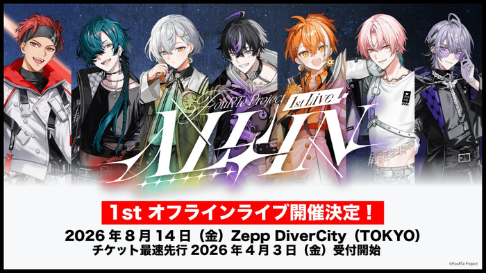 **株式会社ClaN Entertainment(本社:東京都港区、代表取締役社長:大井基行)がプロデュースする7人組バーチャルアイドルグループ「FouRTe Project(フォルテ・プロジェクト)」が、グループ初となるオフラインライブ「FouRTe Project 1st LIVE "ALL IN"」を2026年8月14日(金)にZepp DiverCity(TOKYO)にて開催することが決定しました。**