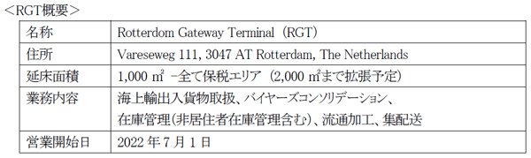 当社オランダ法人であるHANKYU HANSHIN EXPRESS (NETHERLANDS) B.V. は、欧州最大の貿易港を擁するロッテルダムに、新倉庫「Rotterdom Gateway Terminal」(ロッテルダム ゲートウェイ ターミナル、以下RGT)を開設し、7月1日より営業を開始します。