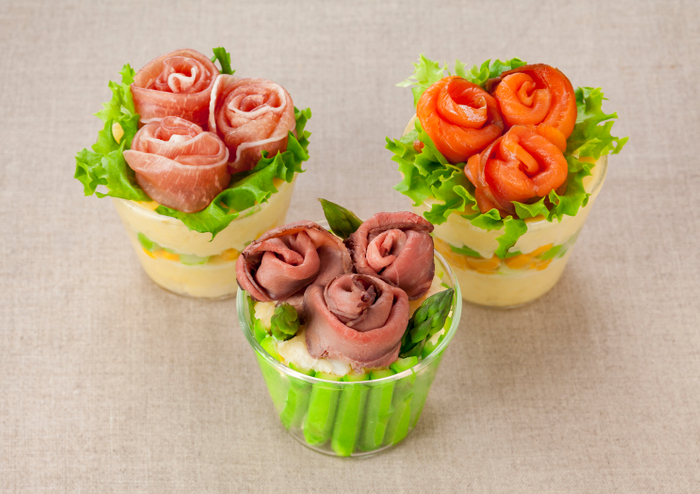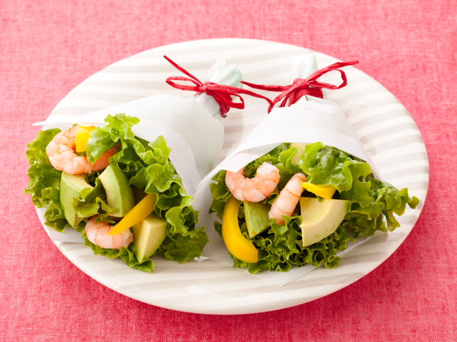 「ブーケサラダ」の作り方は、簡単。ラッピングシート(市販のクッキングシート)に野菜を巻いて、花の形にしたスモークサーモンなどの具材をのせるだけ。