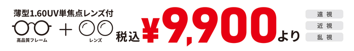うす型1.60UV単焦点レンズが付いて、メガネ一組 税込¥9,900より、その他豊富にご用意しております。