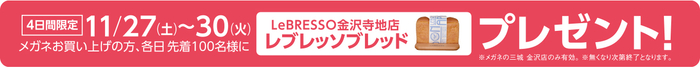 11/27(土)~11/30(火)の4日間、OPEN記念としまして、メガネお買い上げの方、各日先着100名様に「LeBRESSO(レブレッソ)」の食パンをプレゼントいたします!