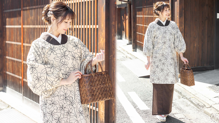 京都きもの町はキモノにも似合うお洒落なオリジナルデザインの割烹着を販売している和装ブランドです。昨年はさらに「通年着られるタイプのデザインもほしい」というユーザーの要望に応え、人気柄の生地デザインはそのままに、より幅広い層が着用できる【エプロン】を新たにリリースし好評となりました。今年はかねてから人気だった「編み物風」に新色を追加、「ベージュ花」は従来の割烹着タイプから、新たにエプロンタイプを追加しました。