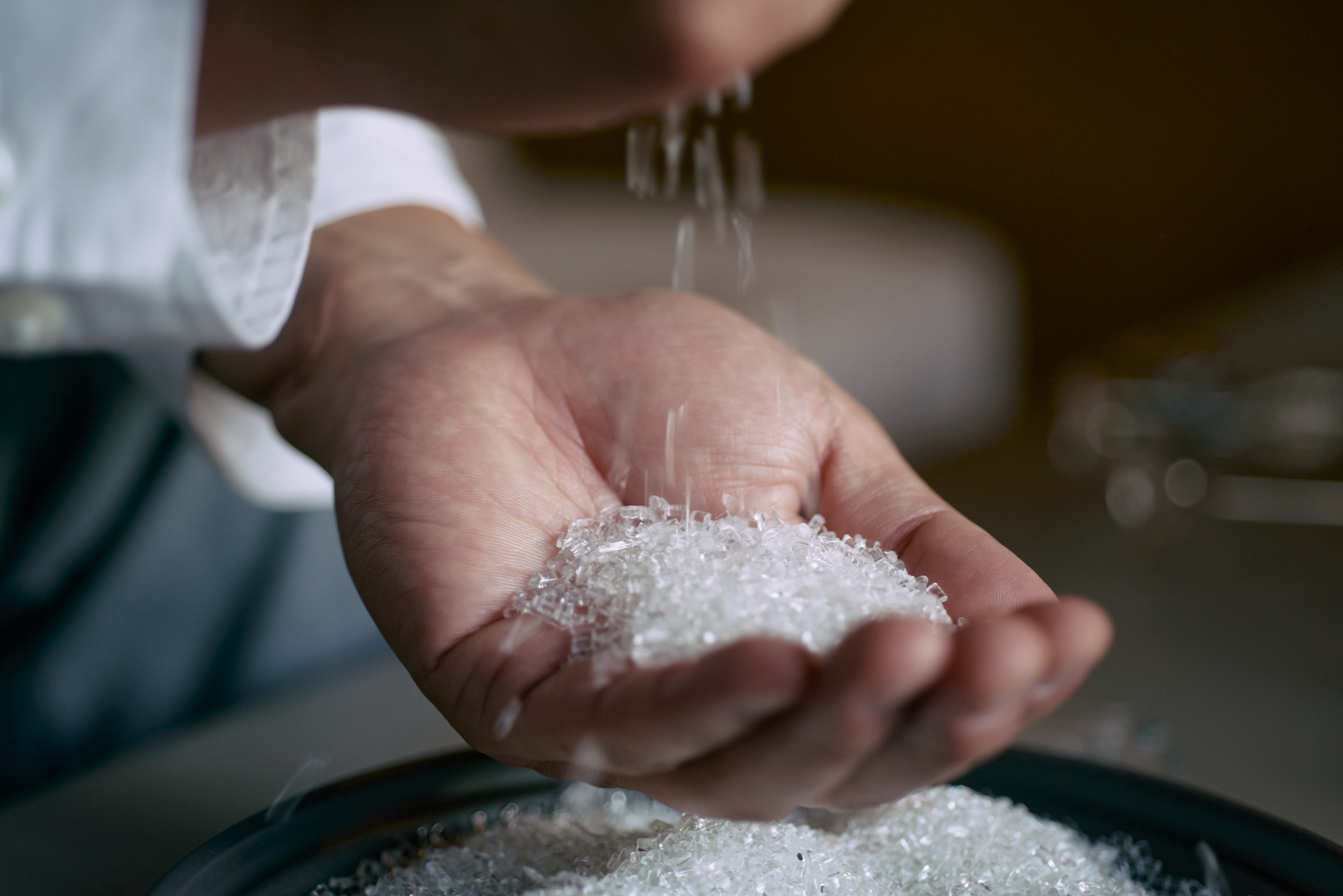 その厳しい管理下のなかで、製品化されずに長期在庫となり行き場のなくなったレンズを囲うパーツ「リム」のアップサイクルを行い、通常の製品以上の完成度で商品化を行うことに成功しました。1mmにも満たない傷が入ったもの、デザイン的に基準外となったために商品化されなかったものを職人が手を加え、通常の3倍の時間をかけて磨きアップサイクルすることにより、無駄な廃棄やリサイクル工程におけるCO2の排出を減らして完成度の高い新たな製品として生まれ変わりました。