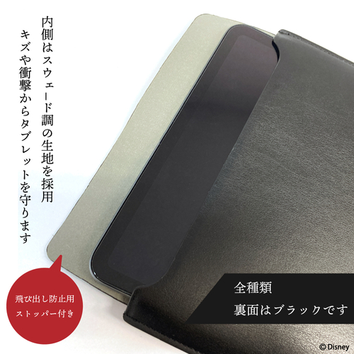 『ディズニー ツイステッドワンダーランド』のキャラクターデザインの8~11inchのタブレットに対応した汎用スリーブケースです。外側には高級感のあるPUレザーを採用し、内側はタブレット本体を優しく包み込むスウェ―ド調の生地を採用しキズや衝撃からタブレットを守ります。また、内側には飛び出し防止用のストッパーが付いています。軽量・スリム設計でカバンにもスッキリ収納。収納可能サイズは横幅が約272mm、高さが約195mm以内となります。
