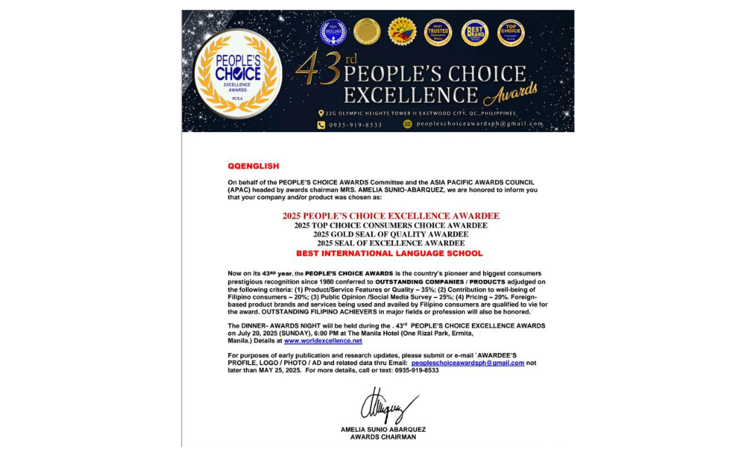 株式会社QQEnglish(本社:東京都渋谷区、代表取締役:藤岡頼光)は、2025年7月21日にフィリッピンのThe Manila Hotelで開催された「第43回 PEOPLE’S CHOICE EXCELLENCE AWARDS」にて、日本人が経営する語学教育分野で3部門同時受賞を達成しました。