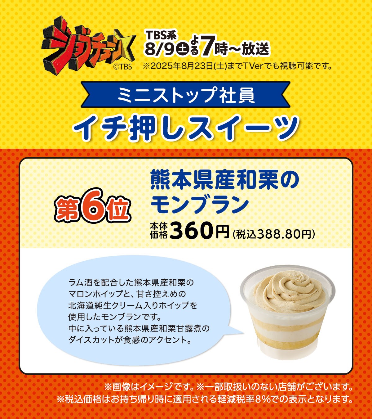 ミニストップ株式会社(本社:千葉県千葉市)は、8月9日(土)に放送されたTBS系『ジョブチューン』の人気のジャッジ企画に登場した「ミニストップVS超一流スイーツ職人 従業員イチ押し!商品TOP10」にて、6度目の挑戦をし、10品中8品合格、満場一致3品の結果となりました。