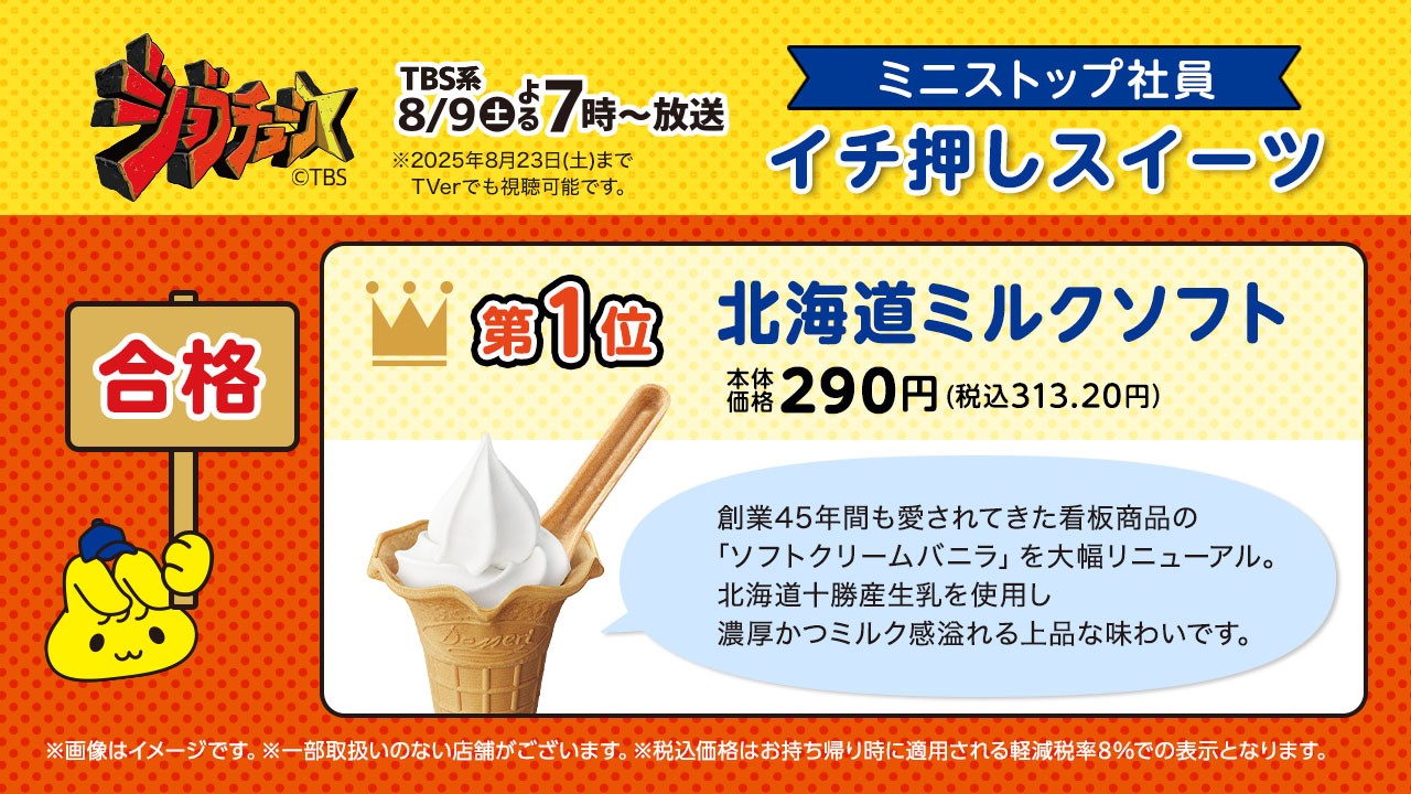 TBS系『ジョブチューン』、ミニストップ6度目の挑戦! 8品合格&満場一致3品!! 対象商品購入で北海道ミルクソフト値引きレシートクーポン、対象商品購入でミニストップアプリくじ企画 8月9日(土)~開始!!