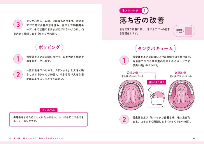 紙面はもちろん、QRコードから動画を確認することもできるので、1日5分の舌ストレッチが今すぐ気軽に始められます。