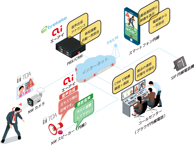 日本ブレケケが提供するBrekeke PBXにエーアイの音声合成を連携させ、TOAの提供するSIP対応IPスピーカー(IPオーディオシリーズ)から、音声情報を一斉通知または特定箇所にのみ通知など、通知先を制御して音声放送を行うことができます。さらにTOAの提供する防犯カメラ(TRIFORAシリーズ)と連携することで、滞在者数や人数カウントの検知をきっかけに、スマートフォンアプリ(Brekeke Phone)、またはコールセンター製品(WEBブラウザPhone)を使用した現地映像の確認と拡声放送、エーアイが提供する音声合成による自動放送が可能となります。