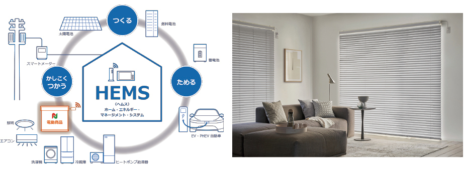 窓まわり商品とエアコン、照明等を連動させることにより、省エネにつながります。