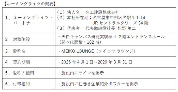 対象施設は、天白キャンパス研究実験棟Ⅱ2階エントランスホール(以下、「本施設」)で、2026年4月1日から2029年3月31日まで本施設の愛称は「MEIKO LOUNGE」となります。