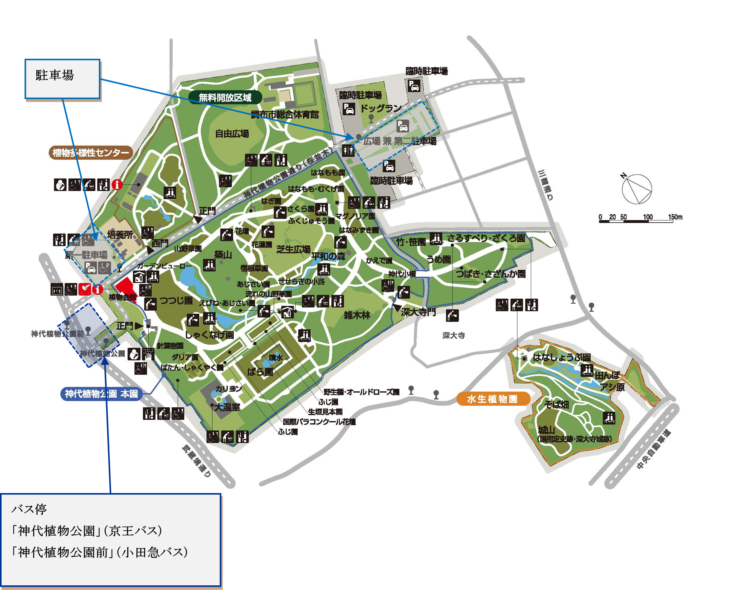 ・調布駅から小田急バス吉祥寺駅または三鷹駅行き「神代植物公園前」下車、または京王バス深大寺行き「神代植物公園」下車