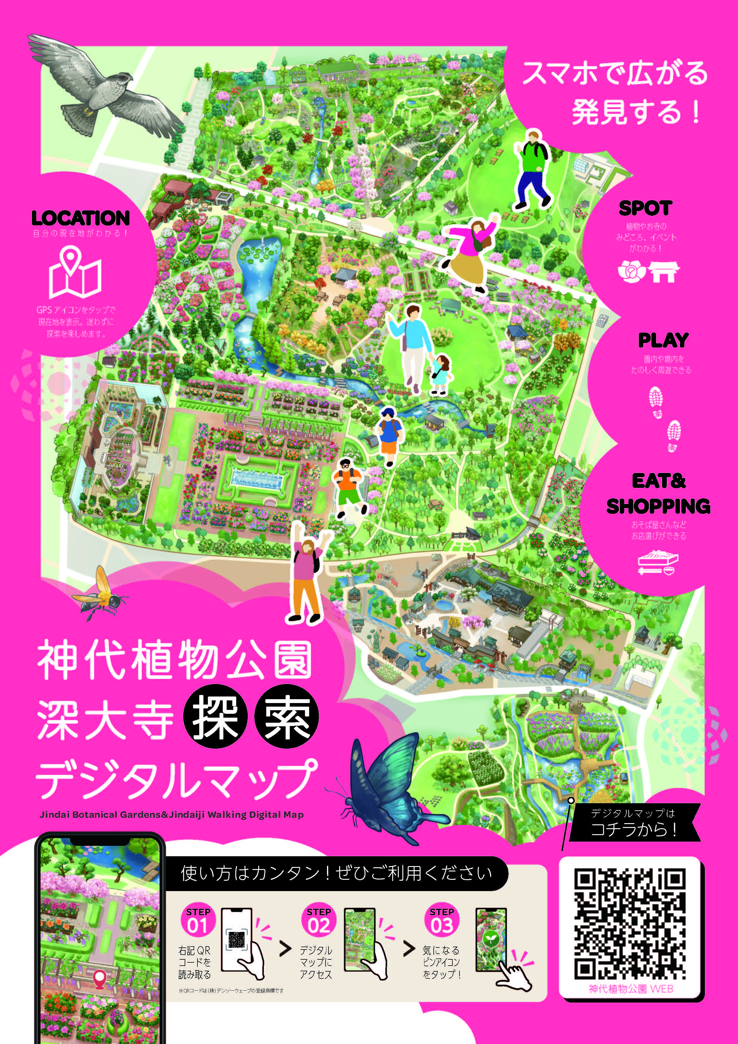 ・イラストスタイルの地図上に、神代植物公園や隣接する深大寺などの景観が描かれ、ユーザーが視覚的にも楽しめるデザインです。