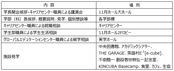 さらに、大阪会場では、学長による開会挨拶、キャリアセンター職員によるキャリア講演会のほか、学生の起業を支援するKINCUBA Basecampなどの施設見学、さらに留学希望者が増えていることを踏まえて、グローバルエデュケーションセンター職員による留学相談も行います。