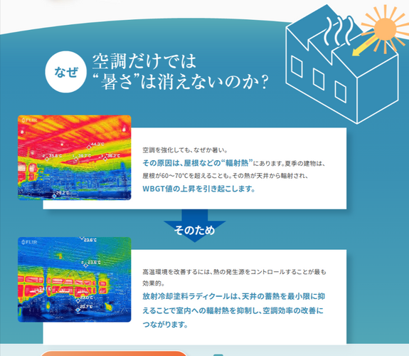 「なぜ空調だけでは暑さは消えないのか?」という視点から導入し、課題を提示した上で「ラディクール」の特長と効果を自然に理解できる構成を採用。科学的な根拠を画像と文章の両面で伝えることで、製品の信頼性と価値を効果的に訴求しました。