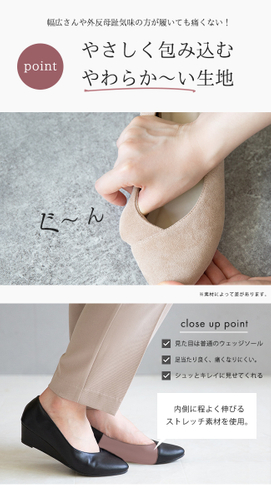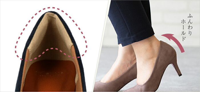 独特の柔らかい生地がクセになる、履き心地ふんわりパンプス。たくさん歩いても足の動きに合わせて靴も屈曲するので、疲れにくいのが特徴です。
