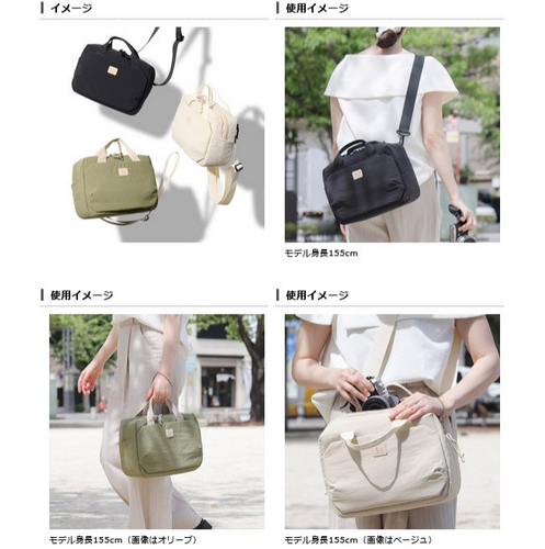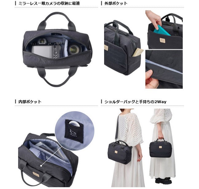 ミラーレス一眼カメラと交換レンズ、財布やスマートフォンなどを収納するのにちょうどいいコンパクトなサイズ感で、カメラを使わない日も普段使いのバッグとして活躍します。