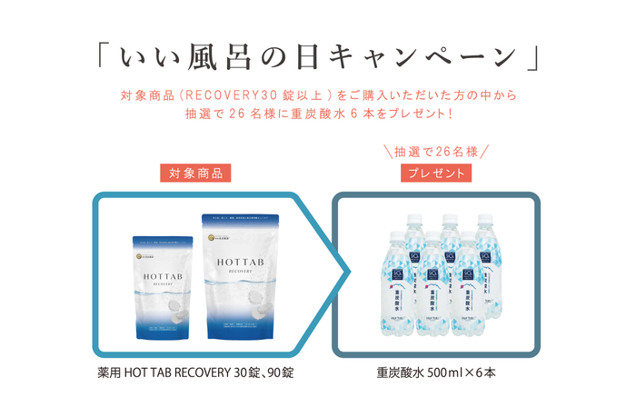 対象商品(薬用 HOT TAB RECOVERY30錠以上)をご購入いただいた方から抽選で26名様に重炭酸水6本をプレゼント!